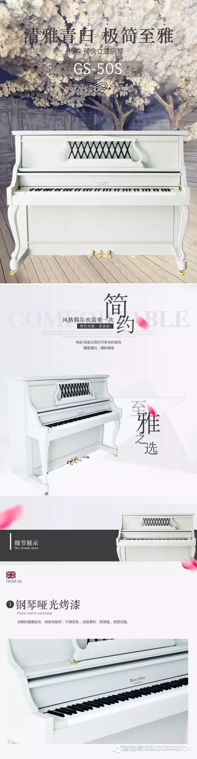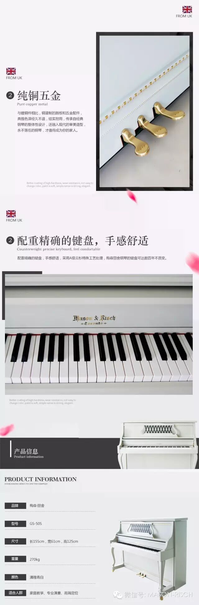 8)配重精确的键盘——手感舒适,采用A级云杉特殊工艺处理,梅森丽舍钢琴的键盘可达数百年不质变。
