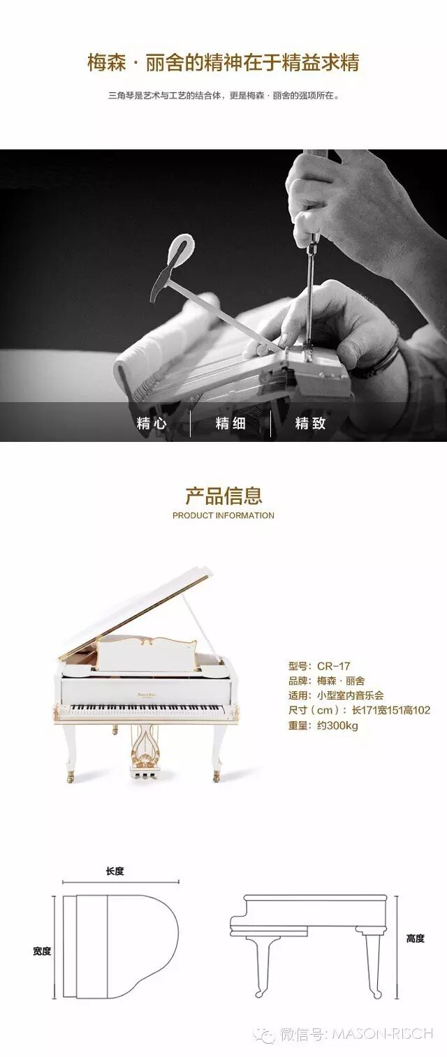 为满足高档钢琴细分市场的需求,梅森·丽舍品牌再推出CR-17系列三角钢琴,由世界著名钢琴设计大师主持研发和制造。